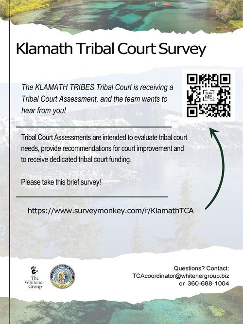 The Klamath Tribes Tribal Court is receiving a Tribal Court Assessment and wants to hear from you. Tribal Court Assessments are intended to evaluate tribal court needs, provide recommendations for court improvement, and receive dedicated tribal court funding!